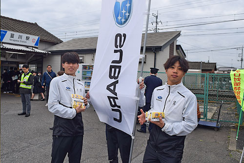 The Gunma Plant, in conjunction with National Traffic Safety Campaign, distributed in the shape of sports uniforms and SUBARU 360-designed reflectors at nearby stations with the cooperation of the SUBARU baseball team, track and field team, and local companies, calling on station users to practice traffic safety.