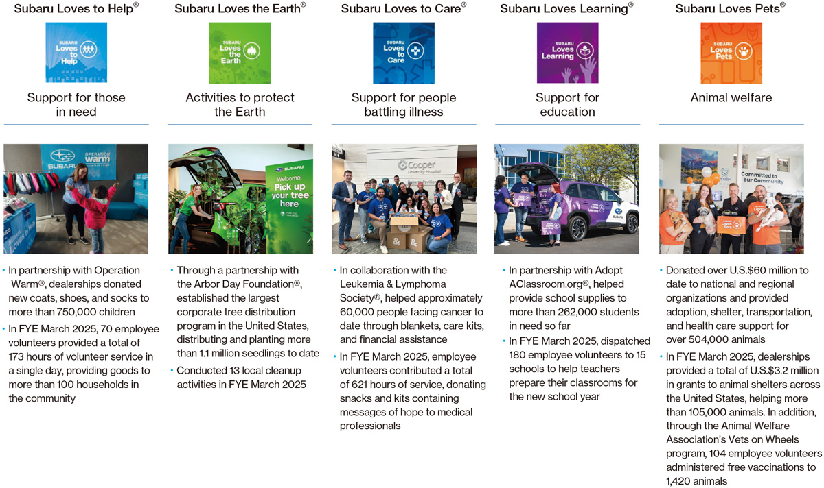SOA has been running the Love Campaign since 2008. This initiative was born in response to customers’ passionate sentiments expressed in the phrase “I love my Subaru.” It is a campaign that aligns with the feelings and values of customers who express their deep affection for SUBARU vehicles using the word “love” rather than “like.” That approach is especially represented during the year-end holiday season by the Share the Love® Event initiative. While large discounts are the norm during this season, the Share the Love® Event gives customers buying a SUBARU vehicle during this period the chance to select a charity aligned with their interests for SUBARU to donate to. This initiative aligns with the values of our customers who prioritize community engagement. This initiative has been conducted annually since 2008, fulfilling SOA’s social responsibility while deepening its connection with the local community. In FYE March 2025, a total of U.S.$31.7 million was donated to national and local charities, bringing the cumulative total since 2008 to U.S.$319.8 million.