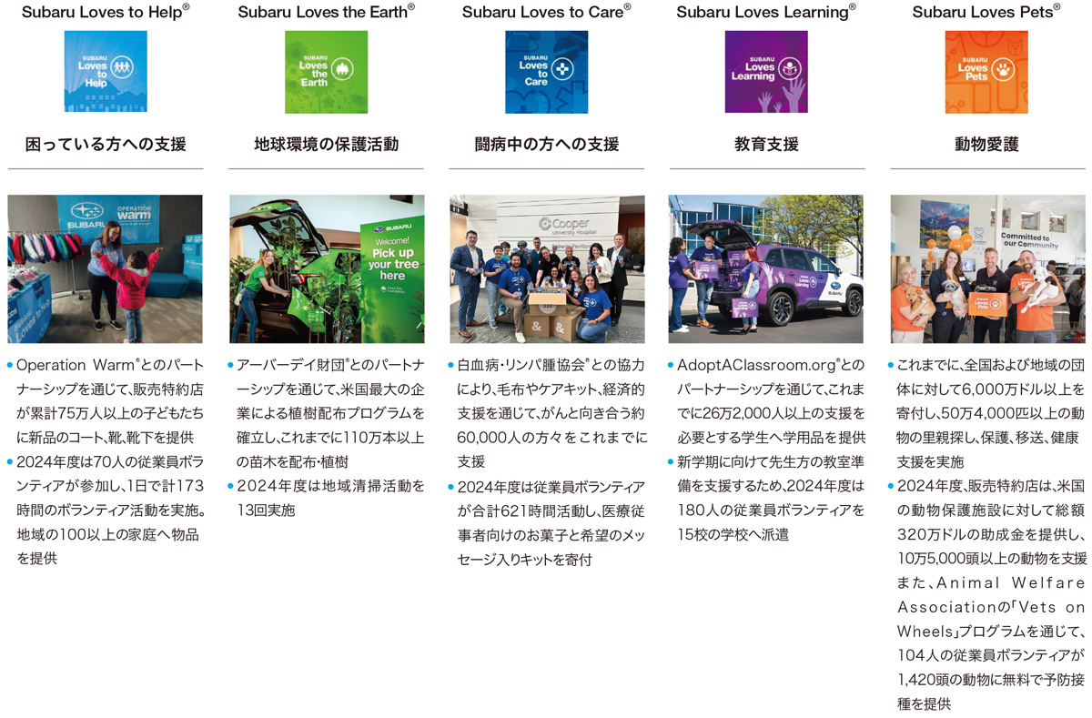 社会貢献 HOME サステナビリティ 社会 社会貢献 社会貢献 メニュー 考え方・方針 体制・マネジメント 取り組み・実績 (地域活動) (環境) (交通安全) (スポーツ・文化) (The Subaru Love Promise®) (一つのいのちプロジェクト) (寄付・ボランティア活動、その他) 閉じる 考え方・方針 SUBARUグループは、社会貢献方針に「社会貢献を企業風土として根づかせ、真に心のこもった活動を行いたい」という考えを織り込み、輸送機器メーカーが果たすべきと考える重点取り組み4分野として「地域活動」「環境」「交通安全」「スポーツ・文化」を柱に活動を推進しています。 社会貢献方針 私たちは、科学技術やのりもの文化の発展、交通安全の普及に貢献します。 私たちは、モノづくりの楽しさ、大切さや尊さを知る、人づくりに貢献します。 私たちは、私たちが活動する地域の発展に貢献します。 私たちは、一人ひとりもよき市民として、社会に貢献することを互いに応援します。 2005年3月制定 社会貢献重点取り組み4分野 体制・マネジメント SUBARUでは、社会貢献をSUBARUグループの企業風土として根づかせ、ステークホルダーに信頼される企業となることを目指し、社会貢献活動を推進していくために社会貢献委員会を設置しています。委員会には各事業所長が参画し、社会貢献の取り組みの推進を図っています。また、部門を横断した企画部会を設置して全社活動の企画立案、活動準備、実施、評価、見直しを協議・検討しています。委員会は年2回開催し、SUBARUグループにおける活動の実績や課題をとりまとめ、改善を行い、活性化を図っています。また、社会貢献委員会で行われた議論などの内容は、サステナビリティ委員会へ報告され、重要な事案は、サステナビリティ委員会を監督する取締役会に付議・報告しています。 社会貢献委員会 社会貢献委員会 体制図 目標と指標 2019年度に、社会貢献の取り組みにおける2025年のありたい姿を設定し、「笑顔をつくる会社」に向けて取り組みを推進しています。 2025年のありたい姿 SUBARUグループに重点4分野選定の背景や成り立ちが理解され、浸透している。 SUBARUグループで重点4分野の関連性を意識した活動が展開されている。 SUBARUグループで働くすべての従業員に社会貢献意識が醸成されている。 社会貢献活動の取り組みにおけるリスク 新型コロナウイルス感染症など、パンデミックの発生は社会貢献の取り組みを行ううえでのリスクとして捉えています。そのような状況下においては、参加者の安全を第一に考え、取り組み内容の変更や感染予防対策の実施など、関係者と協議のうえ、柔軟に対応していきます。 また、現時点の課題として、従業員における社会貢献意識をさらに高める必要があると認識しています。従業員参画型取り組みの強化やグループ会社との連携などを通じ、SUBARUグループ全体で意識醸成を図っていきます。 取り組み・実績 地域活動〈国内〉 地域の皆様とのコミュニケーション SUBARUでは、工場や寮・社宅に隣接している地域住民の皆様と日頃からコミュニケーションを図り、地域に開かれた企業を目指しています。 地元自治体や地域住民、教育機関などとの対話の場も随時設けており、交通安全、環境、災害対応などに関する意見交換や地域ニーズの把握を行っています。 群馬製作所では、毎月、隣接行政区代表のご自宅を訪問して情報交換を実施、現況や環境の取り組みについて説明しています。 宇都宮製作所では、地元行政との協議や各種協賛などにより地域のまちづくり事業に協力しています。地域で実施しているイベントなどを通じて地域の皆様とコミュニケーションを図っています。また、騒音や振動をともなう工事については、地域住民の方々にご理解をいただけるよう、事前に地域の自治会へのご相談を、場合によっては直接のお知らせなども行っています。 本社では、地域で開催される「恵比寿文化祭」への参加や「クリスマスコンサート」、JR恵比寿駅の「駅前花壇」活動への協賛に加え、1階ロビーを地元の祭りで使用される御神輿の組み立ておよび一時保管場所として提供するなど、地域に密着した活動に取り組んでいます。また、災害時の帰宅困難者の受け入れや、昨今の厳しい暑さに備えるため、区民の方が涼める場所として1Fショールームを渋谷区内の民間施設では初となるクールシェアスポットとして提供しています。 工場見学の受け入れ(群馬製作所、宇都宮製作所) 群馬製作所 主に小学生の社会科見学の一環として、工場見学の受け入れを実施しています。小学校の要望に応じてリモート型見学と来場型見学のいずれかで対応をしています。2024年度から、従来の来場型の工場見学では見ることのできなかったプレス機の内部や塗装工程の様子など、臨場感あふれる製造工程の様子を体験できるようにVR機器※を導入しました。 2024年度の小学生向けのリモート型見学は4,804人、来場型見学では20,613人(付き添いの教員含む)が参加してい
