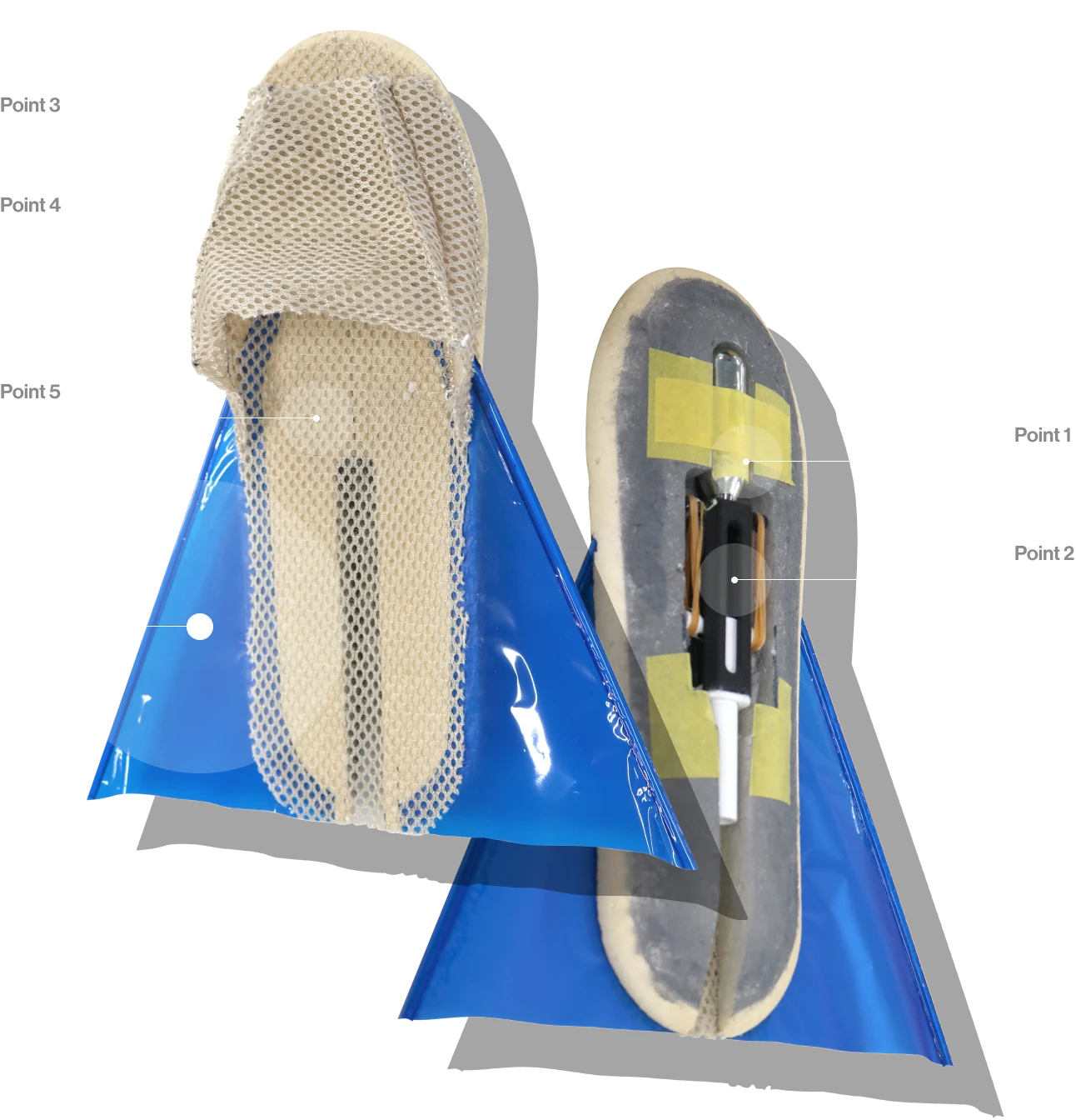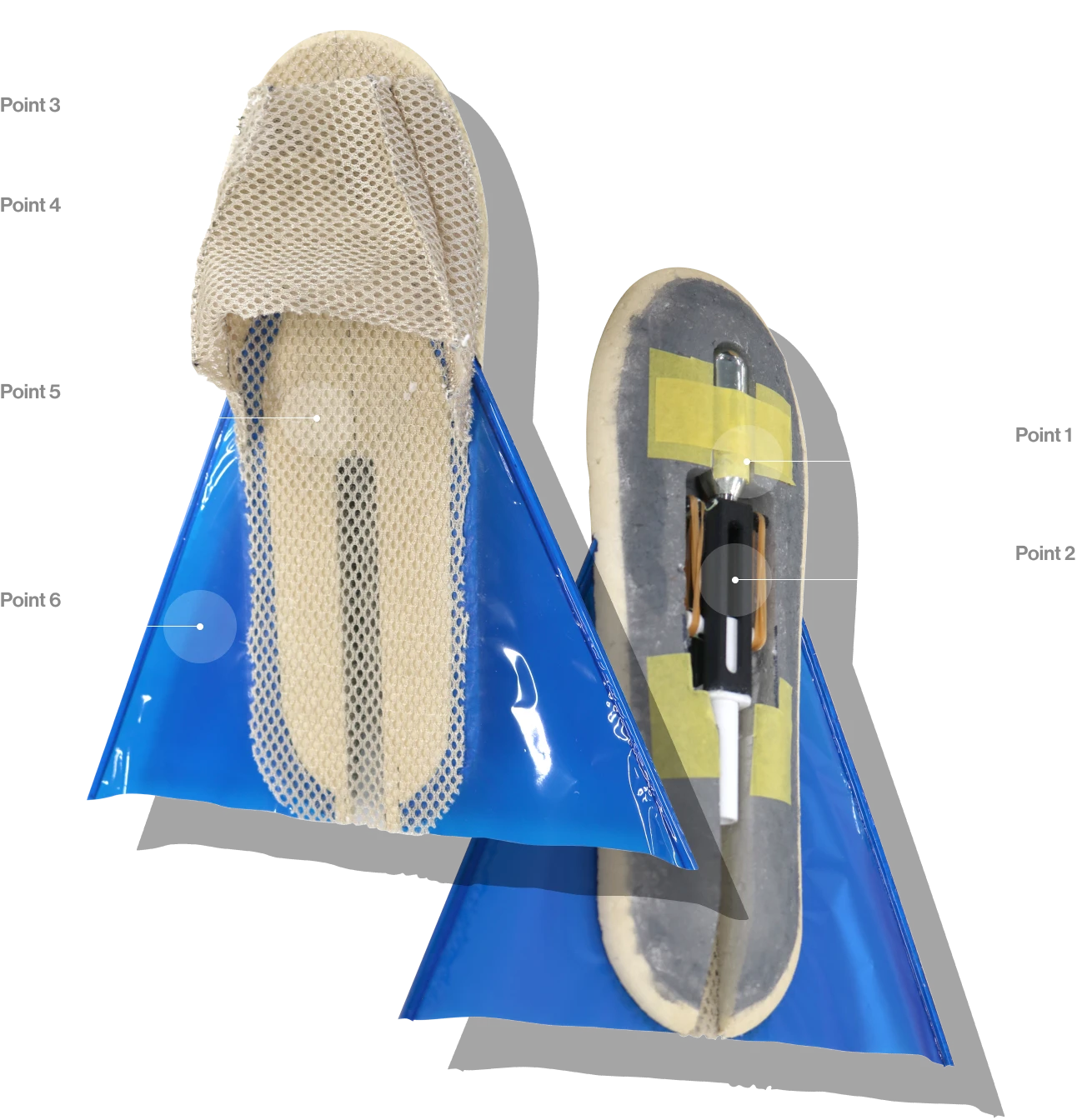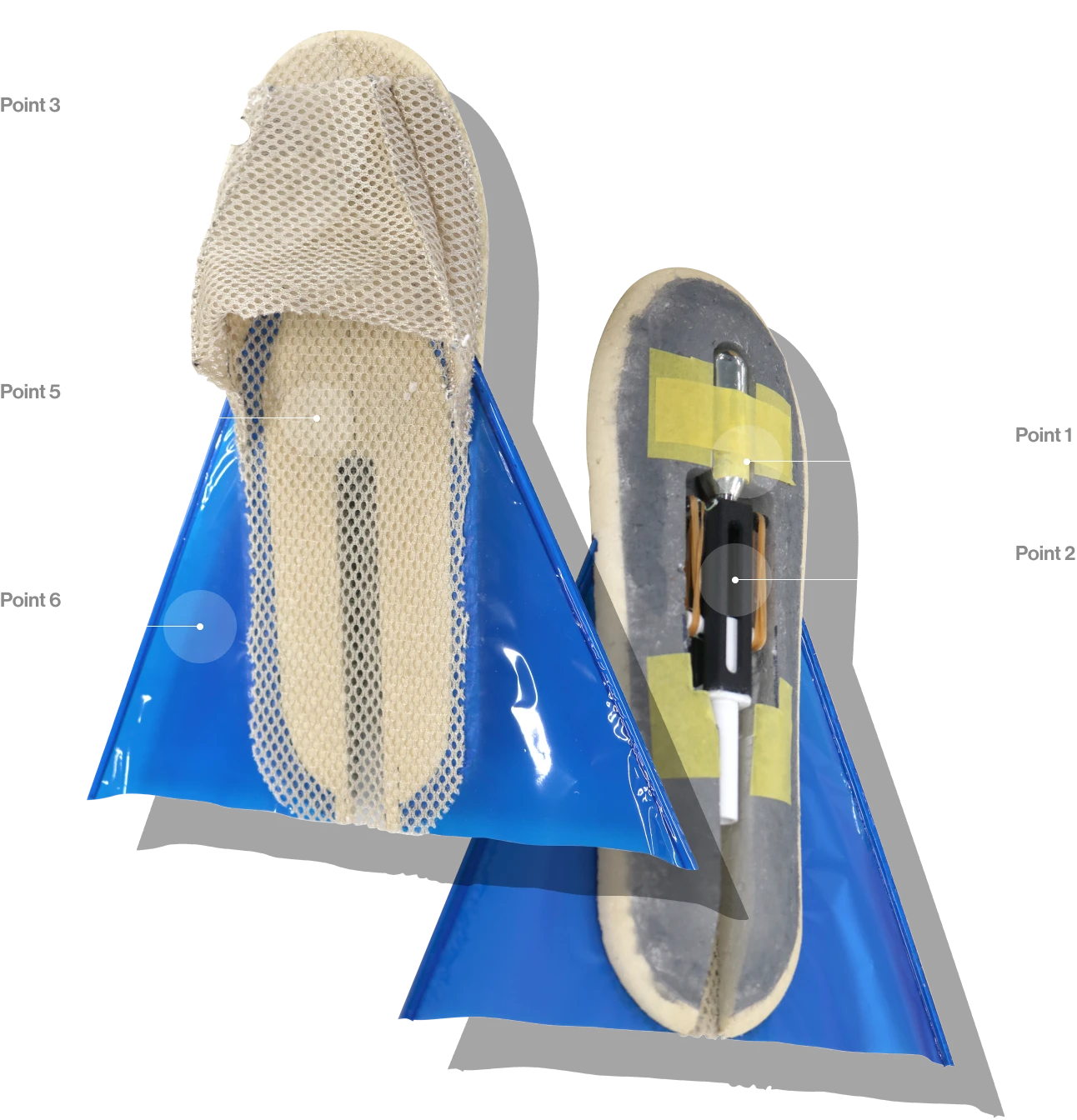 メインボディの材料は履き心地、軽さ、強度を両立できる発泡スチロールを採用。外形はスリッパと同サイズ、厚みはボンベの厚みをカバーできる20ミリメートルに設定した。また、空気抵抗を抑えるために、歩き心地を損なわない範囲で角を削り、船底形状とした。
