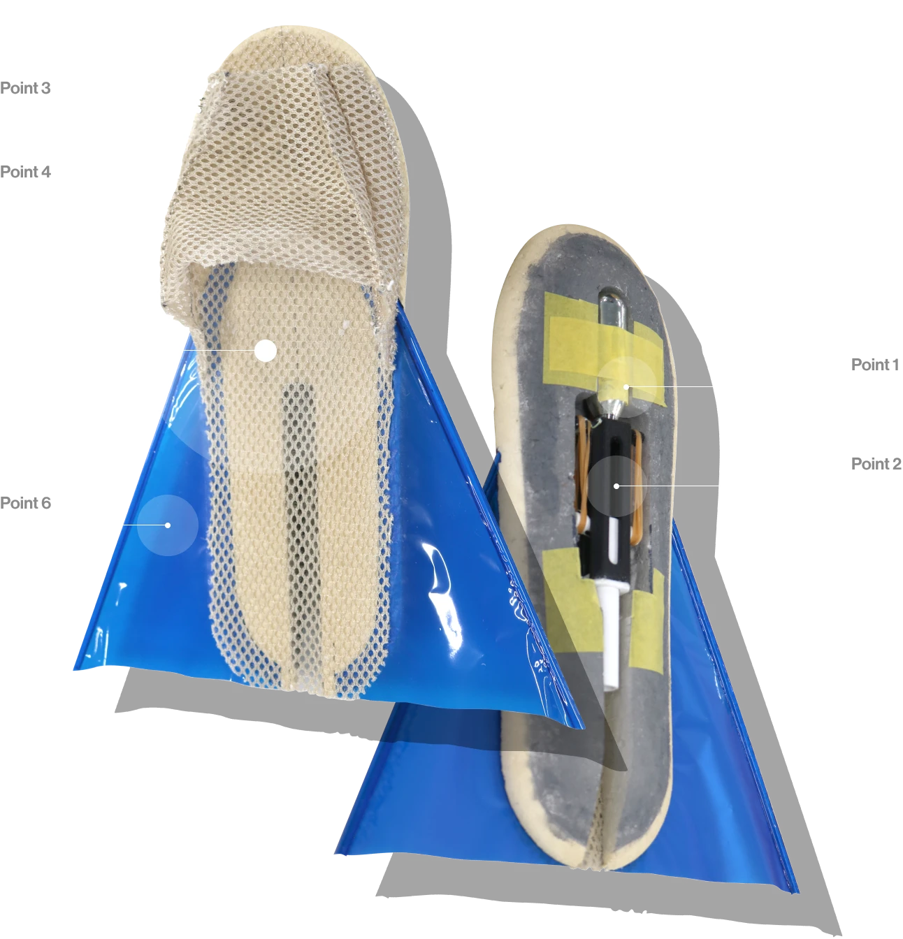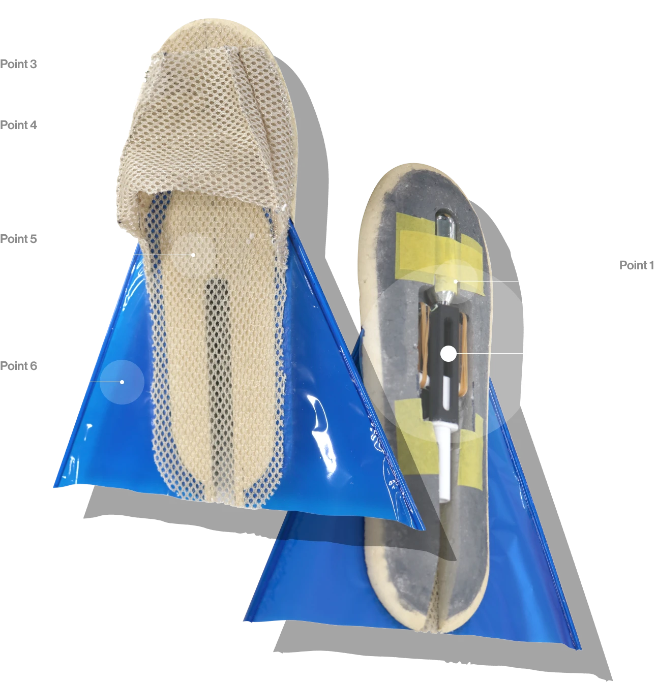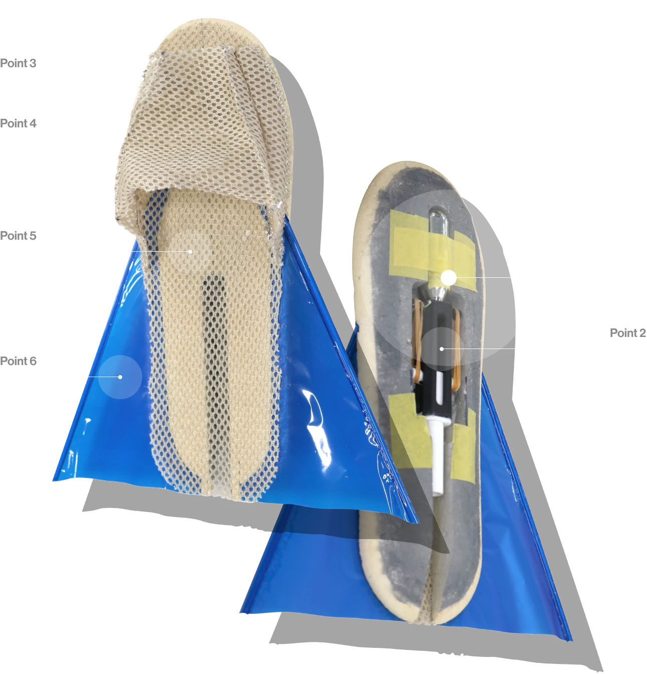 メインボディの材料は履き心地、軽さ、強度を両立できる発泡スチロールを採用。外形はスリッパと同サイズ、厚みはボンベの厚みをカバーできる20ミリメートルに設定した。また、空気抵抗を抑えるために、歩き心地を損なわない範囲で角を削り、船底形状とした。