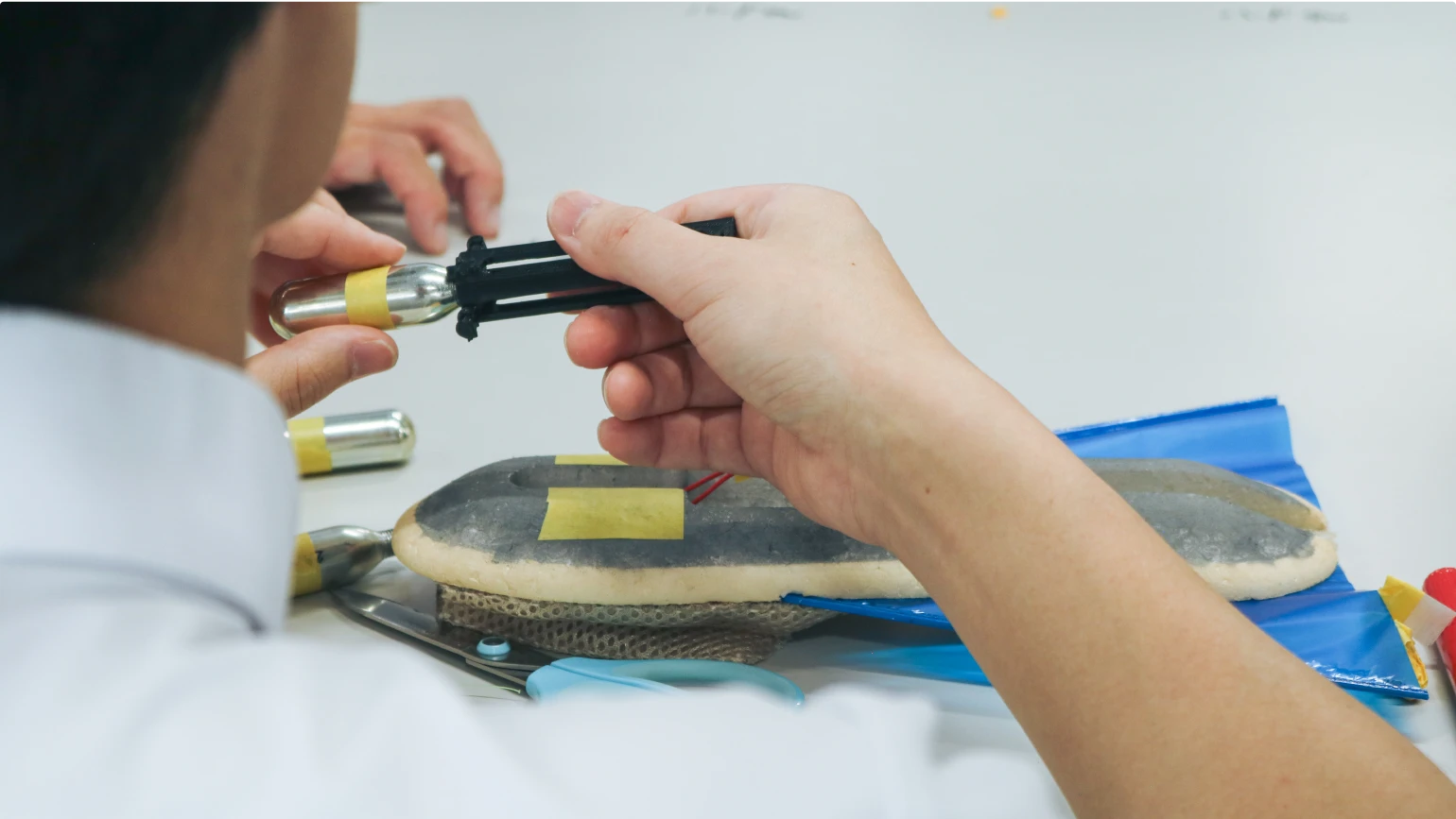 メインボディの材料は履き心地、軽さ、強度を両立できる発泡スチロールを採用。外形はスリッパと同サイズ、厚みはボンベの厚みをカバーできる20ミリメートルに設定した。また、空気抵抗を抑えるために、歩き心地を損なわない範囲で角を削り、船底形状とした。