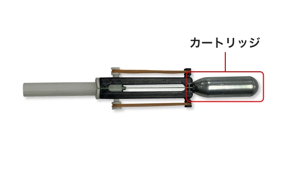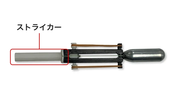 カートリッジにはレールを固定。針付きストライカーがこのレール上をスライドし、ガス解放を担う。ストライカーと輪ゴムは糸により保持され、発射の瞬間を待機。