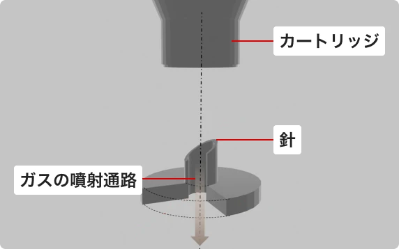 針の座面は平たくし,カートリッジに穴をあける際に針が転ばないように、ガス噴射機構との接合面を確保。また、ガス噴射経路の邪魔にならないよう、針先端には穴をあけ、スムーズにノズルへ流れるようガスの噴射通路を確保した。