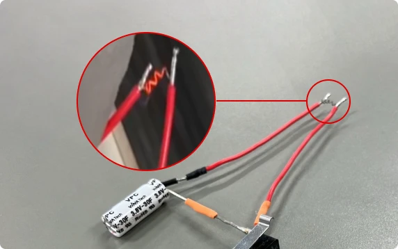 限られたリチウムイオンキャパシタのエネルギーロスを少なくし、ニクロム線の発熱に対してエネルギーを使い切るために、電線長は最短にし、スイッチ等も低抵抗部品を厳選。また、ニクロム線を除く回路全体の抵抗は0.02オーム程度へ低減した。その結果、96%程度の電気効率を達成。
