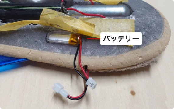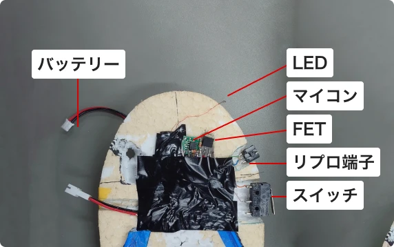 また、キャパシタ式とほぼ変わらない重さを実現するために、細部の調整を行った。軽量化のために絶縁材を使わず、歩行時に踏まれても短絡しない回路レイアウトとした。