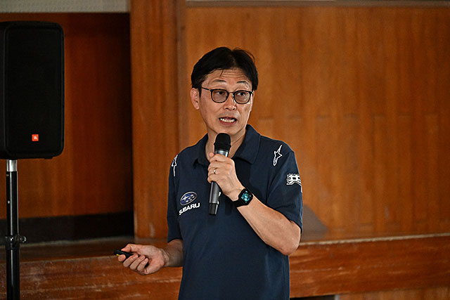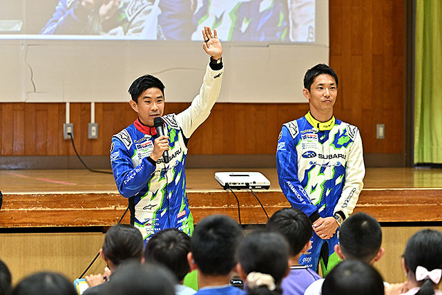 The following day’s class was held at the Rifu Second Elementary School. Representative Director, President and CEO Osaki of SUBARU also joined classes and gave the following remarks, asking the students to consider how we could protect the planet from a carbon-neutral perspective. Next, Masahito Motoi, representative of SUBARU’s Super Taikyu team, and professional racing drivers Takuto Iguchi and Hideki Yamauchi, who also compete in the Super GT races, joined as lecturers. They presented to the students about SUBARU’s ambitious racecars, how carbon-neutral fuel is being used in automobiles, and environmental technologies SUBARU is working on.