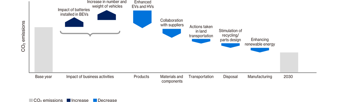 In order to contribute to a decarbonized society, SUBARU has set long-term goals (long-term vision) for 2050 and medium-term goals (milestones) regarding products (Scope 3) and plants and offices (Scope 1 and 2). These medium-term goals are reviewed as necessary according to the business environment, which is experiencing rapid, disruptive changes. In 2023, the medium-term goal for plants and offices (Scope 1 and 2) has been set as reducing CO2 emissions by 60% in FYE March 2036 versus FYE March 2017. The medium-term goal for products (Scope 3) has been re-established as aiming to make BEVs 50% of all automobiles sold in 2030.