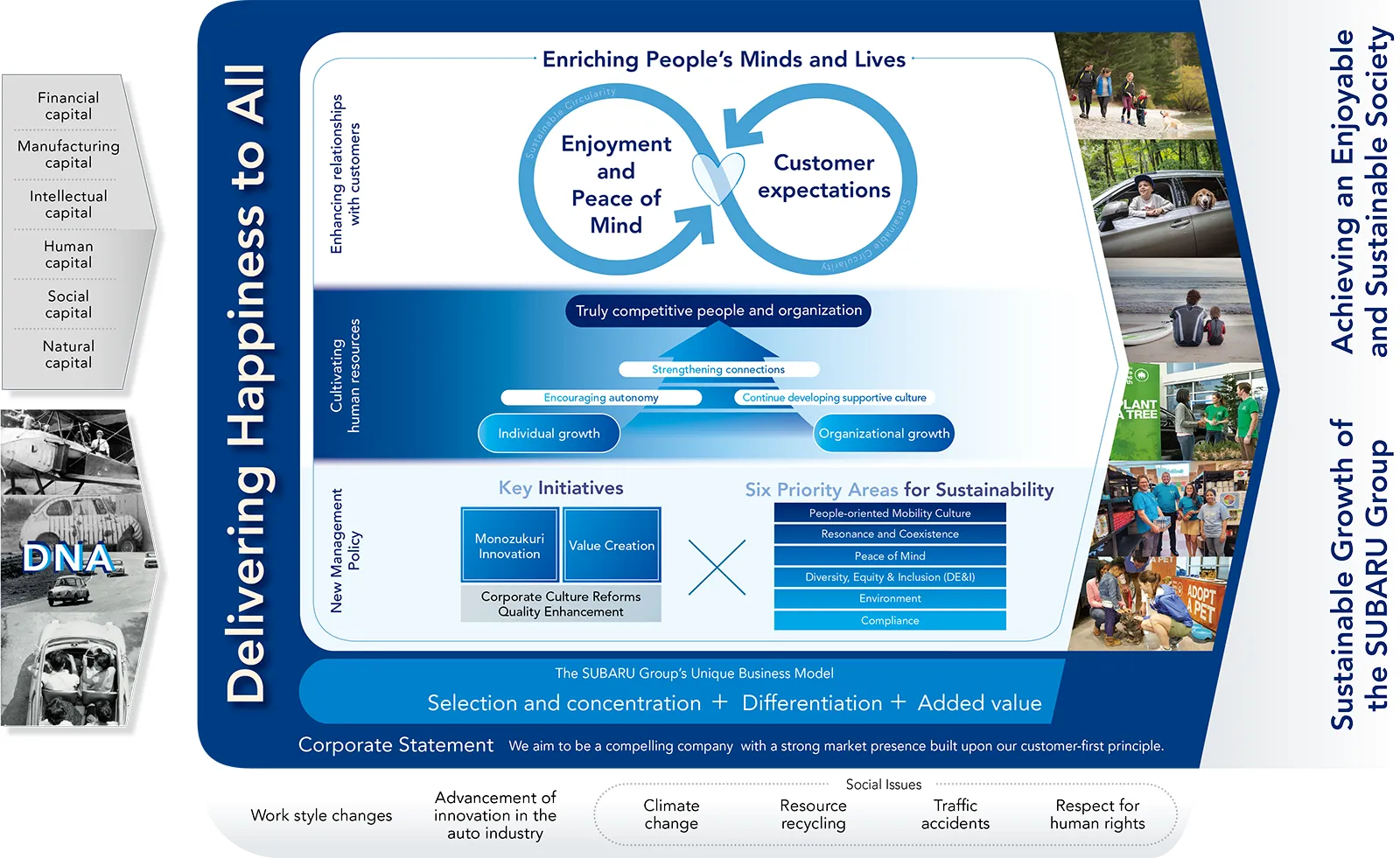 The SUBARU concentrates its limited management resources in pursuit of the value it provides to its customers, which is “Enjoyment and Peace of Mind.” The customers who support us value SUBARU vehicles like lifestyle partners. Together, we are marching ahead to make society better, inspiring our customers to say that SUBARU is “different.” Our vision of becoming a company “Delivering happiness to all” is something that we have learned from the behavior of our customers, with whom we share deep relationships. We will put these customers who have nurtured the SUBARU brand first, and continue to pursue our goal of delivering happiness to people, society, and even the Earth.