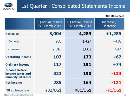 Looking at our consolidated results, Net sales grew 128.5 billion yen year on year to total 428.9 billion yen. This is an all-time high for first quarter sales. This uptick comes from a gain of 128.7 billion yen resulting from a better sales mix variance due to increases in new car sales volumes in overseas markets as well as a gain of 4.9 billion yen from sales increases at three Fuji Heavy Industry (FHI) companies. These gains offset an exchange loss of 5.1 billion yen due to the appreciation of the yen.