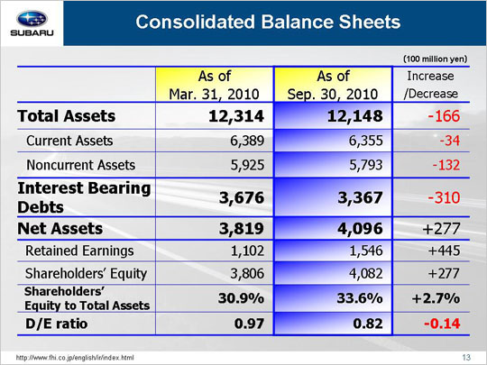 Net assets were up 27.7 billion yen for a total of 409.6 billion yen. This figure includes an increase of 44.5 billion yen in retained earnings and a loss of 15.6 billion yen due to foreign currency translation adjustment.