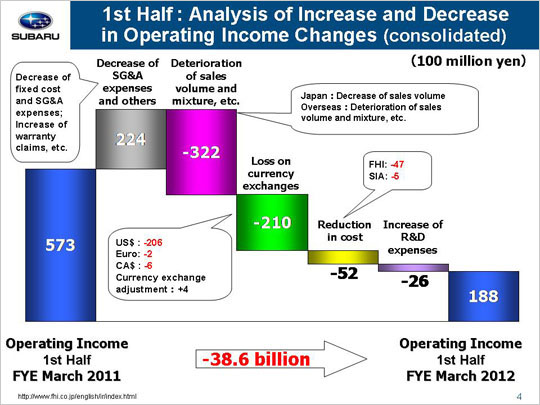 a gain of 22.4 billion yen due to reduced SG&A expenses. Let's look at the three factors behind the increase. First, we see that a reduction in fixed manufacturing costs generated a gain of 9.8 billion yen, with a gain of 8.9 billion yen coming from FHI and another gain of 0.9 billion yen at SIA. FHI yielded a gain of 5.2 billion yen due to cost cuts for suppliers’ dies and a gain of 3.7 billion yen due to lower fixed processing costs. SIA lost 0.1 billion yen due to increased costs for suppliers’ dies and gained 1.0 billion yen due to a reduction in fixed processing costs. Next we see that a drop in SG&A expenses produced a gain totaling 13.7 billion yen. FHI generated a gain of 8.0 billion yen due to reduced advertising costs as well as lower transportation and packing costs as a result of lower sales volumes. Domestic dealers also generated 1.4 billion yen as a result of their efforts to cut SG&A expenses. SOA experienced a gain of 5.2 billion yen, while our Canadian subsidiary generated a loss of 0.1 billion yen and our other subsidiaries saw combined losses totaling 0.8 billion yen. The figure for SOA includes a gain of 1.2 billion yen due to reduced advertising costs, etc. in addition to a gain of 4.0 billion yen. This latter gain comes from an approximate 400 dollar drop in the per-unit rebate that brought the 950 dollar cash-back incentive for April through September 2010 down to 550 dollars for April through September 2011. Finally, the third factor includes an increase in costs associated with warranty claims that led to a loss of 1.1 billion yen. This loss was due to the allowance for recalls posted in the second quarter.