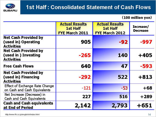 we see that net cash provided by operating activities declined 99.7 billion yen year on year to total a negative 9.2 billion yen. This drop is due to an approximate 33.0 billion yen decrease in net cash as a result of an increase in trade receivables that occurred once production began rebounding from the damage of the 3-11 disasters. A decline in overall profitability also caused net cash to decrease.