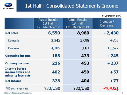 Net sales grew 243.0 billion yen (37.1%) year on year to total 898.0 billion yen. This is an all-time high for first fiscal half sales. The uptick comes from a gain of 244.3 billion yen resulting from a better sales mix variance due to increases in new car sales volumes in overseas markets as well as a gain of 7.1 billion yen from sales increases at the three internal companies. These gains offset an exchange loss of 8.4 billion yen due to the appreciation of the yen.