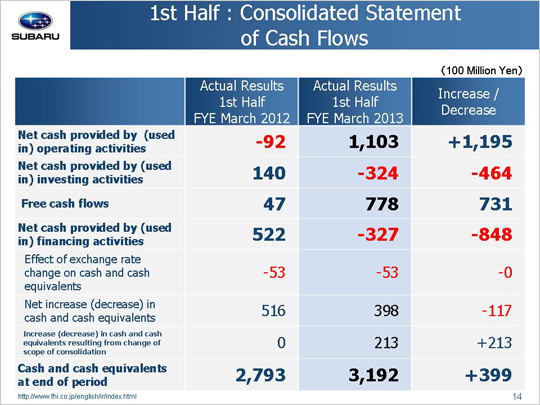 Moving on to cash flows, we see that net cash provided by operating activities increased 119.5 billion yen year on year to total 110.3 billion yen. This uptick is due to steady production and sales in contrast to the same period last year when working capital dropped as a result of stagnant production following on the heels of the March 11 earthquake.