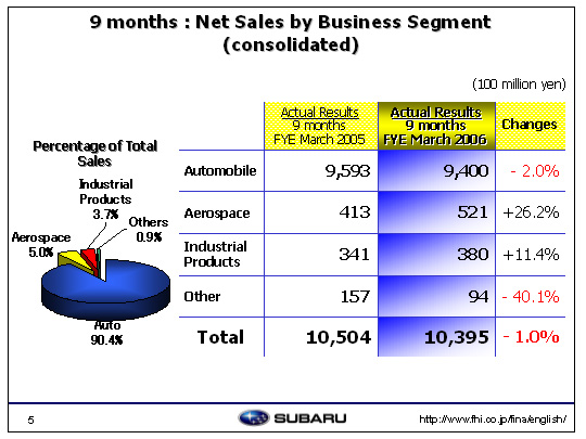 | Net sales by business segment shows increases in sales and profits for the Aerospace and Industrial Products Companies. The Aerospace Company saw an increase in sales of CX/PX as well as the sales volume for Boeing 777 and 737 aircrafts owing to the company’s recovery. Sales were up for the Industrial Products Company mainly for engines sold in overseas markets. Sales in other areas fell due to the shrinking operations at Yusoki Kogyo K.K. |