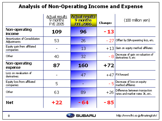 The major factor in the difference in non-operating expenses was an increase of 4.7 billion yen in the loss on revaluation of derivative, arising from the forward exchange contracts.