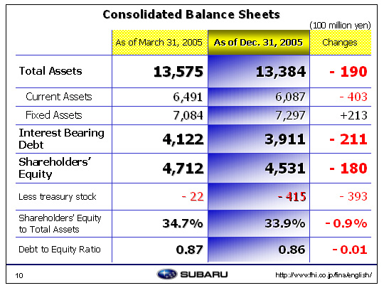 Regarding interest-bearing debt, a 10 billion yen straight bond was reduced and 10 billion yen in commercial papers released by our subsidiary, Subaru Finance Co., Ltd., were repaid. This led to a decrease of 21.1 billion yen to 391.1 billion yen since March 2005. The debt-to-equity ratio was 0.86%.2.6 billion yen was amortized for the consolidated adjustment account in relation to SIA’s payment of fixed costs and 7.1 million yen of the settlement with Isuzu was paid.In shareholders’ equity, while there was 7 billion yen of dividends paid, this was offset by 3.5 billion yen of accumulated earnings from new equity method affiliates. The current net income was 12.8 billion yen and accumulated earnings increased by 9.2 billion yen. As a result of share buyback following the dissolution of the strategic alliance with GM and the initiation of a new business alliance with Toyota, the treasury stocks of FHI increased by 39.3 billion yen to 41.6 billion yen. Additionally, losses in the translation adjustment account have declined owing to the weak yen. Total Shareholders’ equity came to 453.1 billion yen.