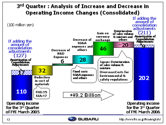 We suffered a loss of 2 billion yen due to a deterioration in sales volume and mix. This amount included a loss of 4.6 billion yen in domestic sales due largely to a significant decline in the sales volume of the Legacy and the R2 as well as the unfavorable product mix for the Legacy. Overseas sales increased by 5 billion yen. This includes a 10 billion yen loss in FHI export due to costs associated with improving specifications to meet safety and environmental requirements which could not be reflected in the sticker price. Inventory adjustments and others caused a decrease of 2.4 billion yen. These factors combined led to an increase of 9.2 billion yen in operating income. |