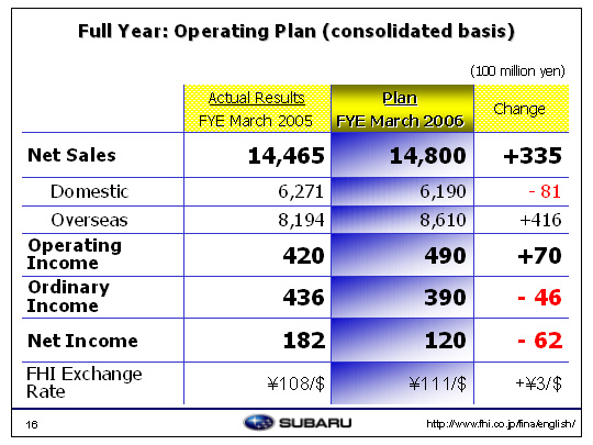 As for net income for this period, extraordinary losses will include a loss of 5.6 billion yen associated with the cancellation the joint development with Saab, which was accounted for in the first half, costs associated with the early retirement program implemented in the third quarter totaling 7.9 billion yen, a decrease in asset-impairments to approximately 6 billion yen as well as 5 billion yen as a result of disposal of fixed assets. However, extraordinary gains amounting to 5 billion yen were posted as a gain on sales of investment securities. This is forecasted to result in net income of 12 billion yen, a 6.2 billion yen year-on-year decrease.
