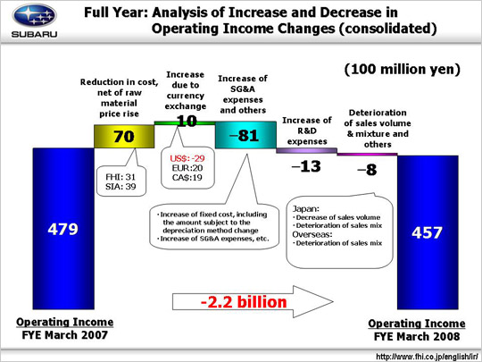 Increased R&D expenses (from 50.7 billion yen to 52.0 billion yen) resulted in -1.3 billion yen in operating income. The increase is attributed to the new Impreza and Forester models and a diesel engine vehicle released last fiscal year, a multi-passenger vehicle to be released this fiscal year, Legacy to be introduced next fiscal year, and an increase in R&D expenses that support environmental measures.