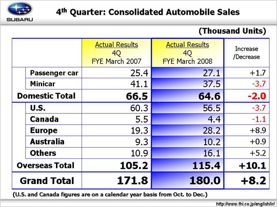 During the 4th quarter, consolidated sales volume of automobiles in Japan decreased by 2 thousand units in total. Specifically, sales volume of passenger cars increased by 1.7 thousand units, including an increase of 6 thousand units of Forester. Sales volume of minicars other than the R2 decreased by 3.7 thousand units.