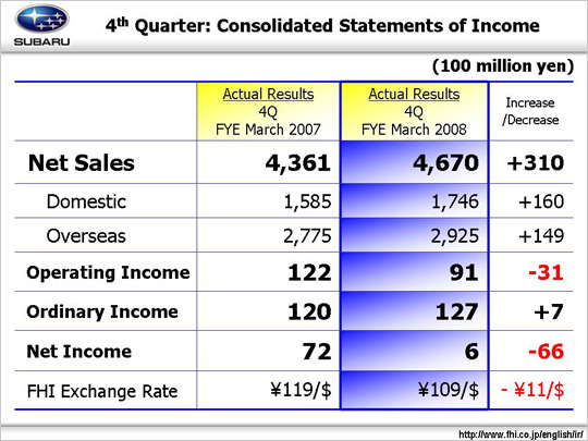 Although net sales in the 4th quarter increased, other account items, except ordinary income, decreased due to the stronger yen against the US dollar, and increased fixed costs and SG&A expenses.