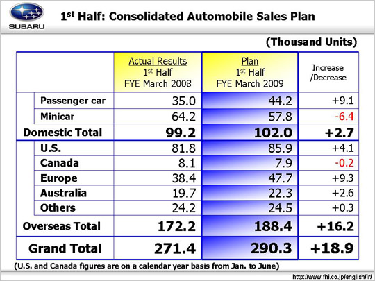 Our consolidated automobile sales plan for the first half of the fiscal year ending March 31, 2009 sets an increase of 9.1 thousand units of passenger cars in Japan, in anticipation of a new Forester model and others to be released. However, since we have no plan to release new minicar models, sales volume of all models will see a decrease of 6.4 thousand units. As a result, we forecast a combined sales volume increase of 2.7 thousand units of passenger cars and minicars.