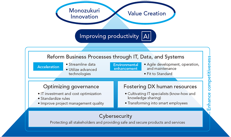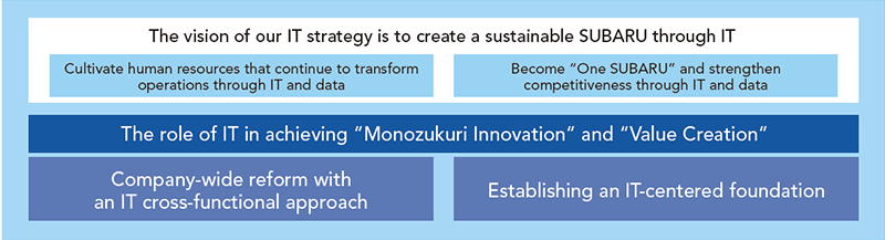 In the automotive industry, which is facing a period of major transformation, SUBARU is working to meet customer expectations and enhance its corporate competitiveness by advancing efforts to achieve “Monozukuri Innovation” and “Value Creation,” as outlined in the SUBARU New Management Policy. Amid the rapid advancement of IT and digital technologies across society, our IT strategy is driven by the vision of creating a sustainable SUBARU through IT. Based on this, we will use each of our initiatives to build the foundations of development, manufacturing, sales, and, while also driving transformation across the entire SUBARU Group through IT, creating the agility needed to keep pace with the times.