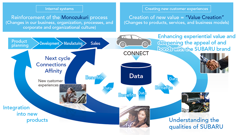 To strengthen the connection between the SUBARU brand and our customers, we are advancing the use of IT, data, and digital technologies with two main pillars: reinforcing the monozukuri process and creating new value. Previously, our systems and data were individually optimized by department, which hindered our ability to effectively utilize valuable data. To address this issue, we are building an environment that centers on data and enables collaboration with various business activities, aiming to create synergistic effects among our diverse initiatives toward achieving “Monozukuri Innovation” and ”Value Creation”. By effectively utilizing the accumulated data, we will enhance the entire monozukuri process, which is becoming more advanced and complex, particularly in electrification. At the same time, we are advancing efforts to provide customers with new experiential value, further deepening our connection with them.