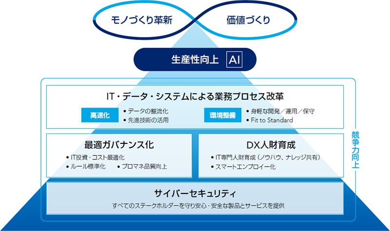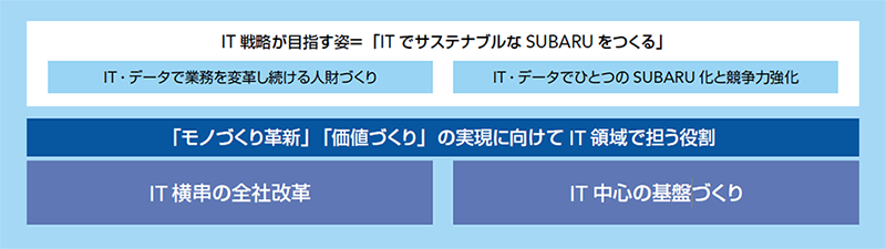 当社が関わるステークホルダーの範囲は、テクノロジーの進化やビジネス・働き方の変化にともない拡大しています。「ひとつのSUBARU」の視点で、当社における国内外の拠点・関連会社・サプライヤーを含むサプライチェーン全体において、ステークホルダーの皆様から信頼いただける業務遂行を継続できるよう、IT投資・コストの最適化、ルール標準化を通じた効率化、プロジェクトマネジメント品質の向上、サイバーセキュリティを軸としたグローバルITガバナンスの確立に取り組んでいます。