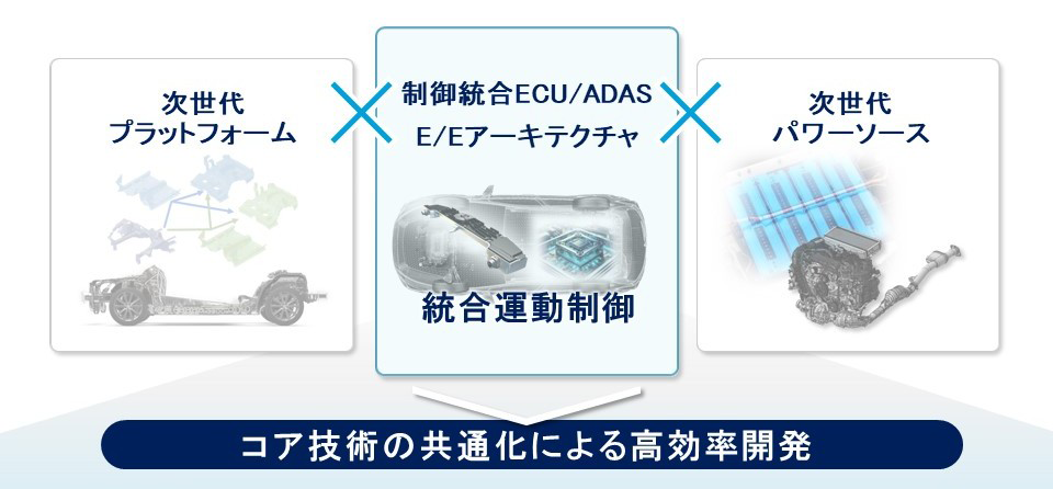柔軟性のポイントは開発の徹底的な効率化にあります。そして、その最大の鍵は、この2年間バッテリーEV開発の場を通じて進めてきた制御統合ECUの拡張にあります。