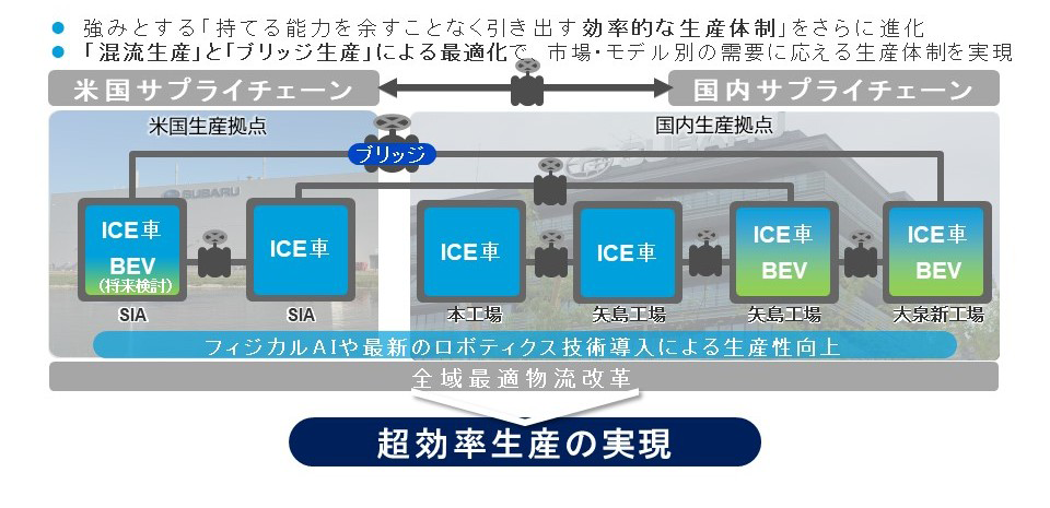 バッテリーEVとICE車は混流生産とし、ブリッジ生産では、日米にまたがる拠点、およびラインごとの連携をより一層高め、グローバル視点での需要変動に柔軟に対応するとともに、設備や人財の稼働率最大化を狙います。