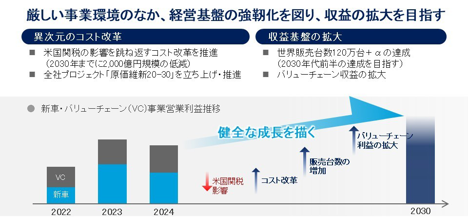 まず、米国関税措置の影響を打ち返すべく、2,000億円規模のコスト低減に向けた「原価維新20-30」というプロジェクトを始動しました。設計段階からお取引先様と協働し、モノづくり革新の成果を最大限に活かすことで、従来の枠を超えた異次元のコスト改革に挑戦していきます。