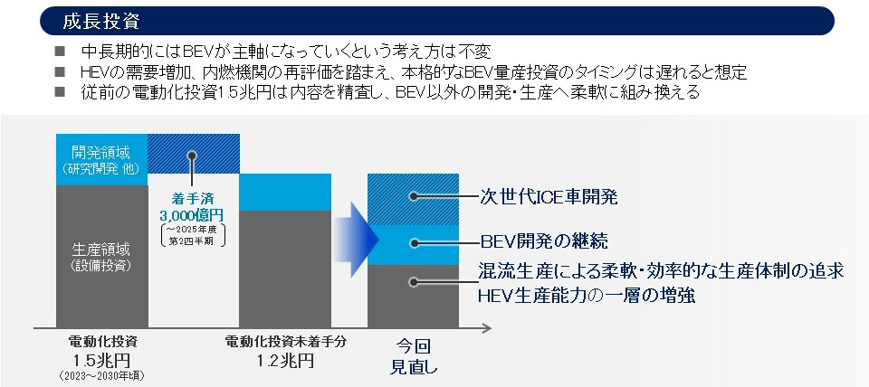 中長期的には、バッテリーEVが主軸になっていくという考えは不変です。一方、ハイブリッド車に対する需要の高まりや、内燃機関が再評価されている状況を踏まえると、本格的なバッテリーEV量産投資のタイミングを遅らせることが適当であると考え、従前の「電動化投資1.5兆円」の内容の精査・見直しを行うこととしました。