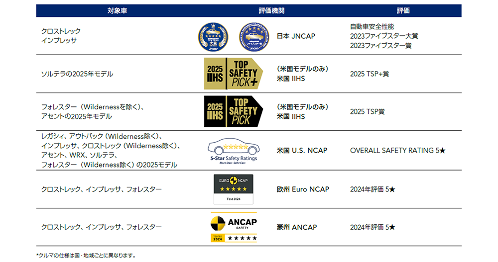 SUBARUは、日本のJNCAP6、米国のIIHS7、U.S. NCAP8、欧州のEuro NCAP9、豪州のANCAP10など国内外の公的機関による安全性能試験・評価を受けており、最高ランクの評価を多数獲得しています。