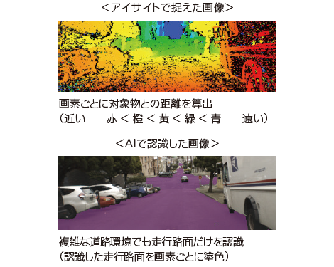 ステレオカメラを用いた空間認識の基本原理は、右と左の2つのカメラに映った画像のズレを三角測量によって解析し、画素ごとに対象物との距離を正確に算出することです。カメラに映るものすべてを高精度に立体化することで、あらゆるものの形や距離を捉えることができることがアイサイトの強みです。しかし、対象が小さな物体や微妙な凹凸などの場合、それを乗り越えるべきか、障害物と判断して止まるべきか、アイサイトの画像認識だけでは判断しきれない非常に難しいケースもあります。一方AIは、過去に学習した膨大なデータをもとにカメラに映った対象物を画素ごとに分類することが得意です。アイサイトで認識した対象物との距離と、AIで認識した対象物の分類を完全に同じ画像上で融合できるため、アイサイトとAIは相性が非常に良いと捉えています。実用化できれば、今まで以上に運転環境の情報を詳細かつ正確に認識することができるようになるため、より様々な状況においてクルマの安全性を高めることにつながると考えています。