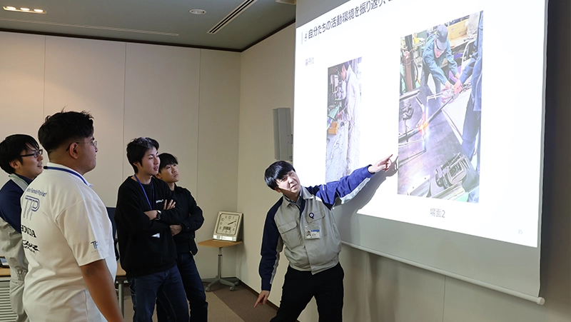 プログラムの中核は、学生フォーミュラ活動を題材としたディスカッションと危険予知活動です。工作機械を用いた製作作業やマシン試走時など、幅広い活動の場面において、事故が発生した場合にどのような影響が生じるのかを多角的に学べる機会としました。事故はケガや物損にとどまらず、大学やスポンサー、ひいては学生フォーミュラ全体の信頼にも影響を及ぼす可能性があることを知り、参加者は安全をより広い視点で捉えるようになりました。