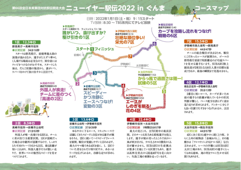 ニューイヤー駅伝は、各地区予選を勝ち抜いた37チームが、群馬県庁をスタートし、7区100キロを競います。