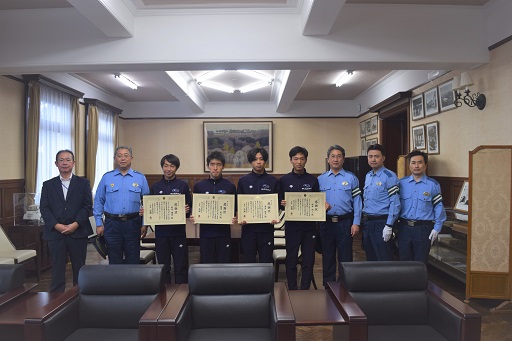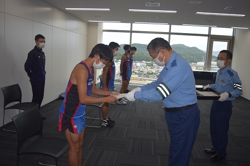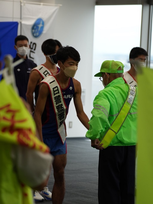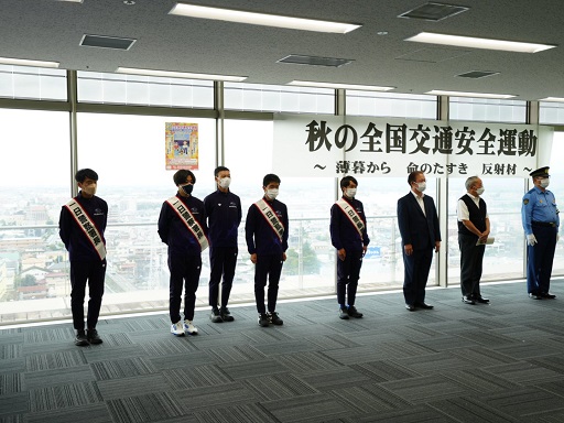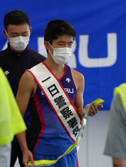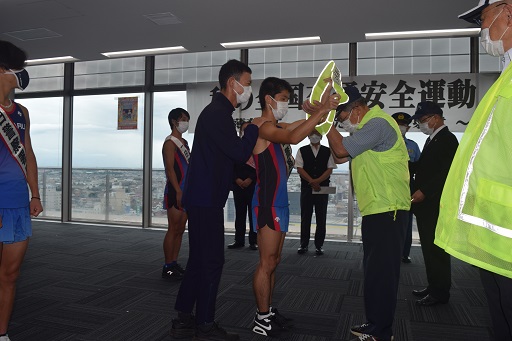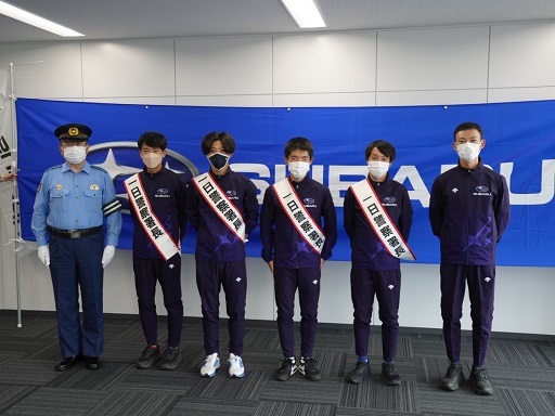 9月20日(火)、令和4年秋の全国交通安全運動の一環で、SUBARU陸上部の照井選手、梶谷選手、清水選手、唐澤選手(ガイド:小林コーチ兼マネージャー)が一日警察署長を務めました。活動のひとつとして、交通事故ゼロへ向けた安全の願いが込められた反射材『タスキ』を関係団体へと繋ぎました。