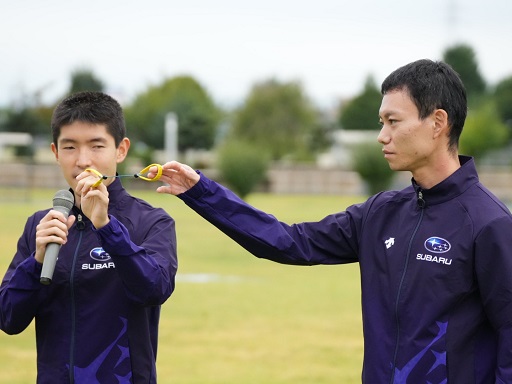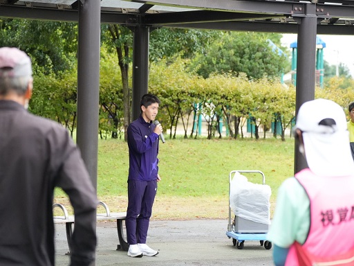 第一部では、青空講演会・伴走体験ということで、私が競技を始めたきっかけや東京パラリンピックまでの道のり、そしてパリパラリンピックへの今後の意気込みなどをお話しさせていただきました。伴走体験では、全員伴走をする側とされる側の体験をしました。「できるかな」、「怖い」などと不安の声が聞かれましたが、皆さん上手に走られていました。