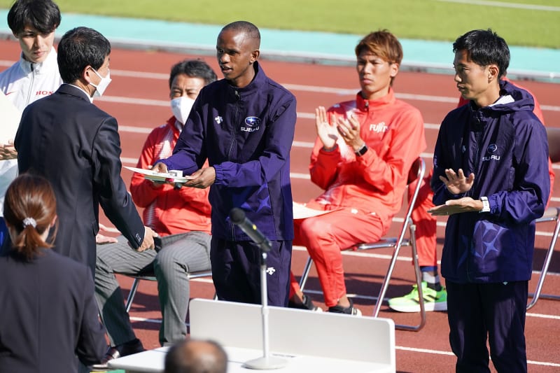 区間トップとなり、表彰されるベンソン選手と照井選手