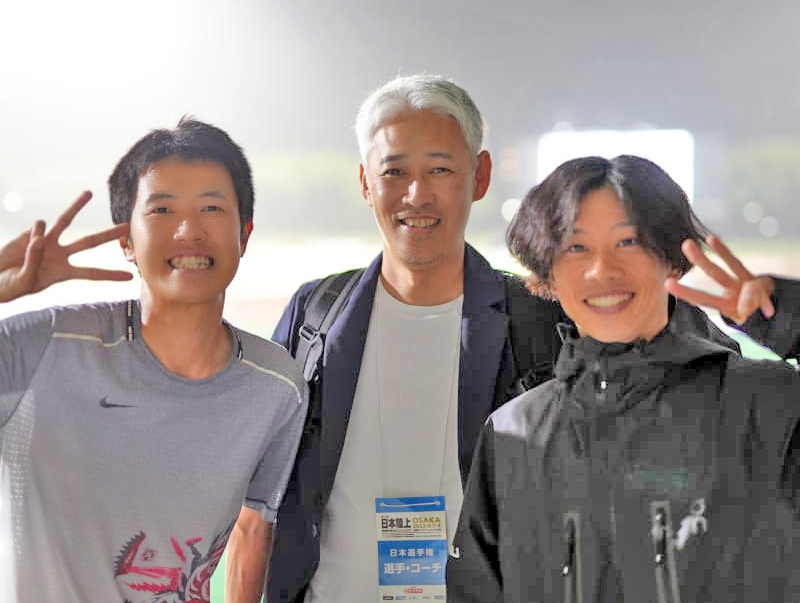 6月の日本選手権の1500mに出場し、3年連続表彰台に上った森田佳祐選手(左)。奥谷亘監督(中央)、5000mで銅メダルを獲得した清水歓太選手(右)と、笑顔で記念撮影