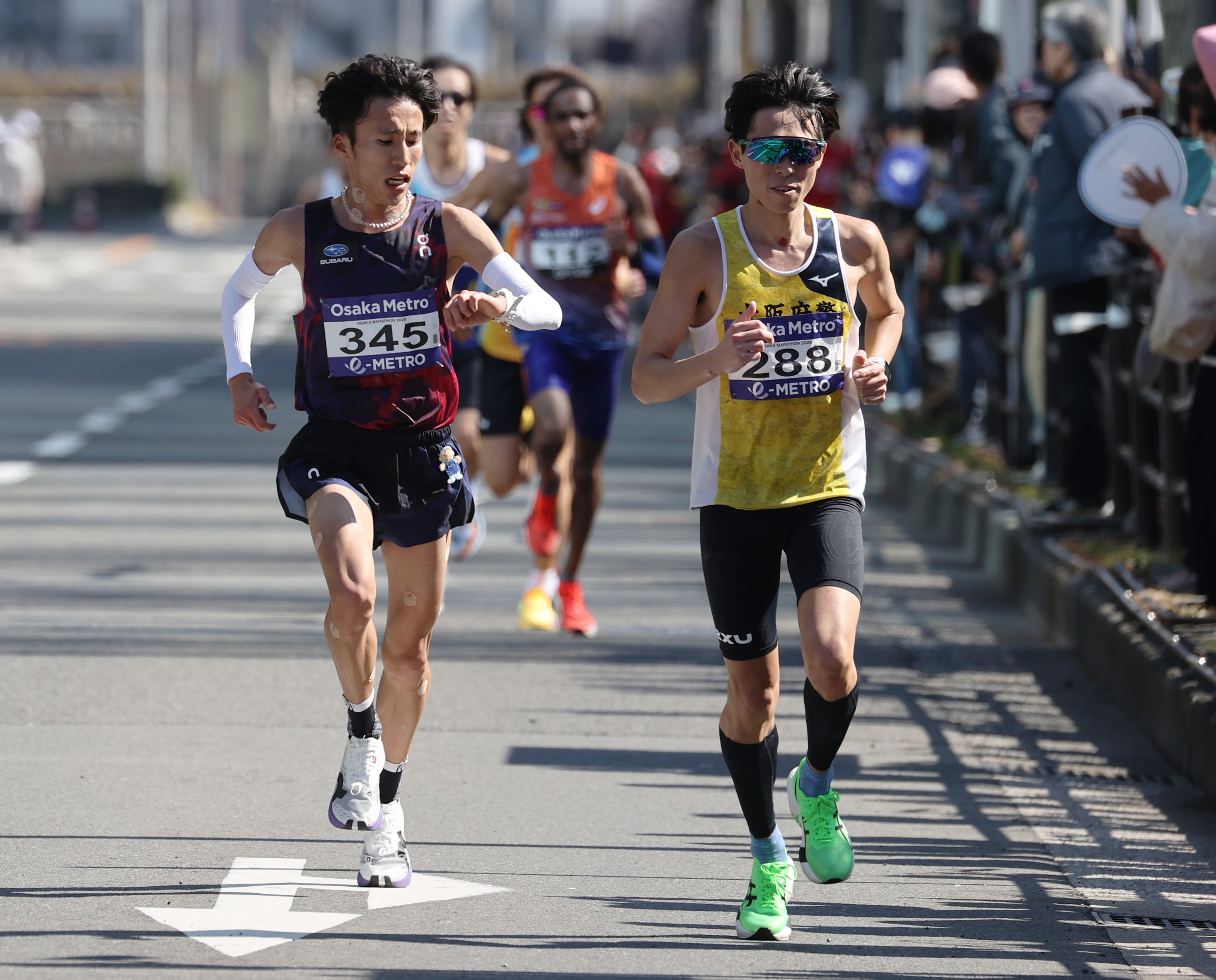 終盤、時計を確認する山本選手。初マラソンでサブ10達成