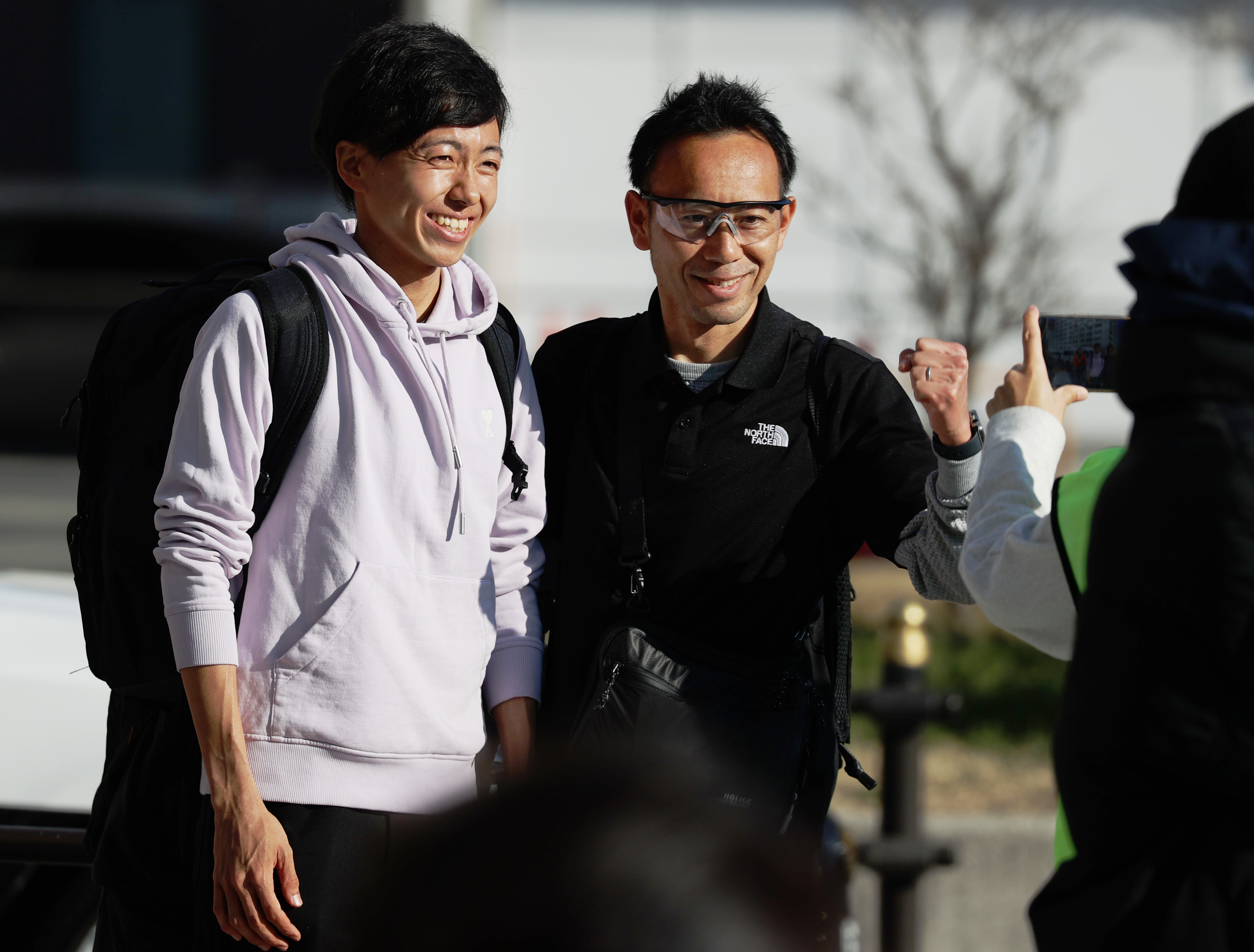 沿道にはチームメイトの姿も。応援に駆け付けた小林選手(左)は、スタート地点・大阪府庁前で声援を送りました