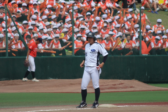 5番 ライト前ヒット セカンドランナーホームイン 7点目 ファーストランナーホームをつくも挟まれタッチアウト チェンジ