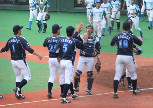 投手:角田(5回1/3)→ 高橋 (3回2/3) 捕手:唐谷 |