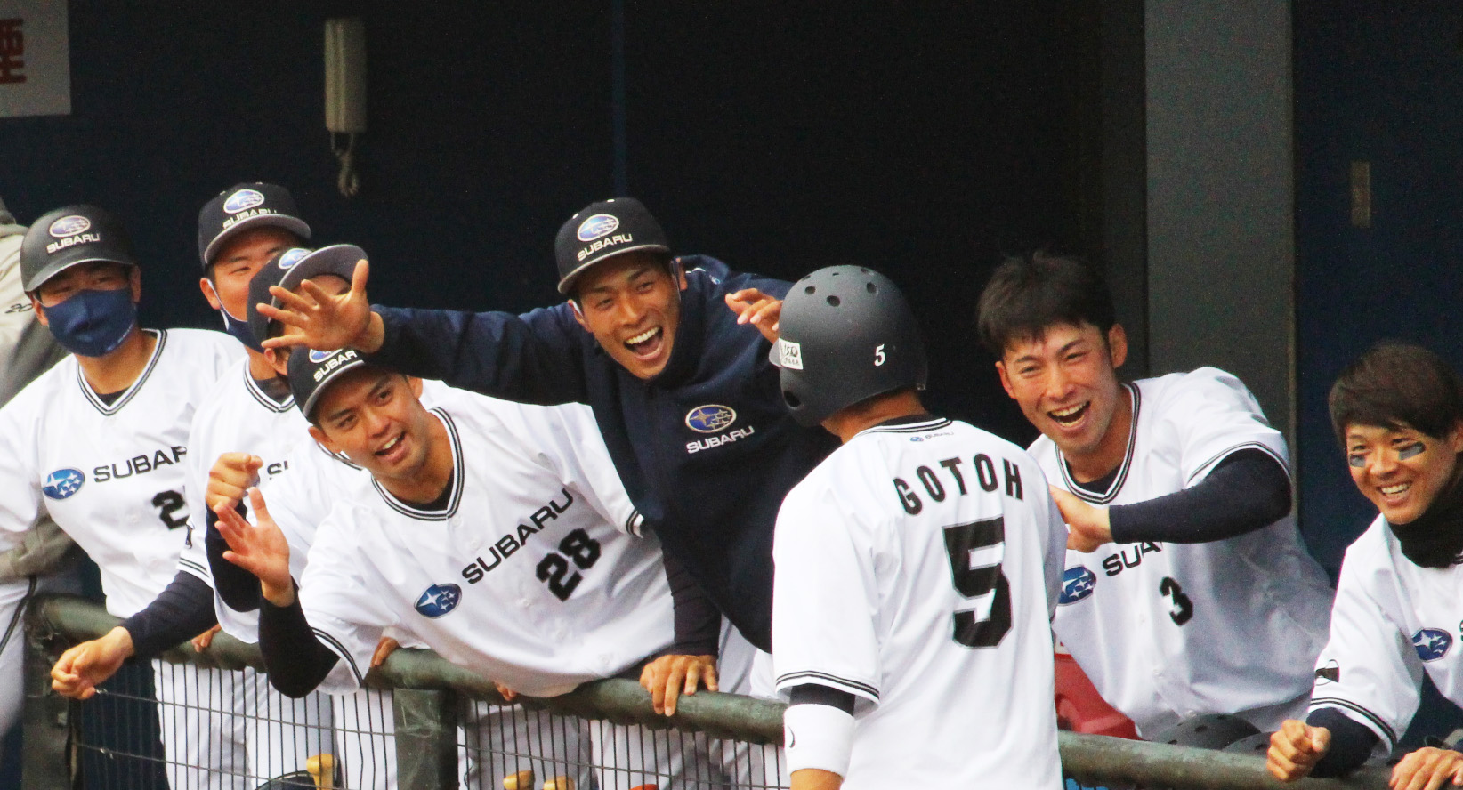 古川選手のタイムリーで還ってきた後藤選手を笑顔で迎えるベンチ