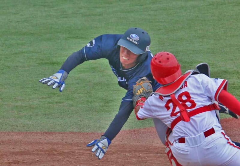 出塁後、日置翔兼選手のヒットで果敢に本塁を狙う石田選手!