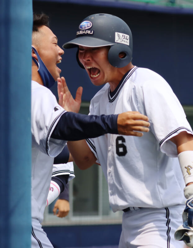 同点のホームを踏んで雄叫びをあげる小玉選手。